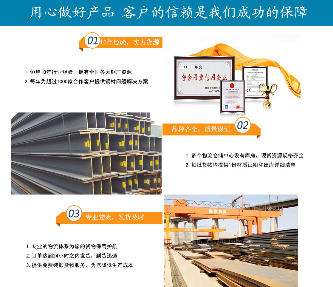蘭州恒坤商貿(mào)有限公司立足于鋼材貿(mào)易,主要經(jīng)營:鋼板、角鋼、工字鋼、槽鋼、H型鋼、鍍鋅槽鋼、鍍鋅角鋼、鍍鋅板、鍍鋅卷、鍍鋅圓鋼、鍍鋅工字鋼多種型號鋼材產(chǎn)品。多年來,我公司始終堅持質量第一,信譽至上的經(jīng)營方針,與酒鋼、包鋼、八鋼、唐鋼、鞍鋼、萊鋼、兗礦、日照鋼鐵、濟鋼,成都、天津等多家企業(yè)達成大批量物資供應協(xié)議,并且與省內(nèi)外多家客戶建立了合作關系。